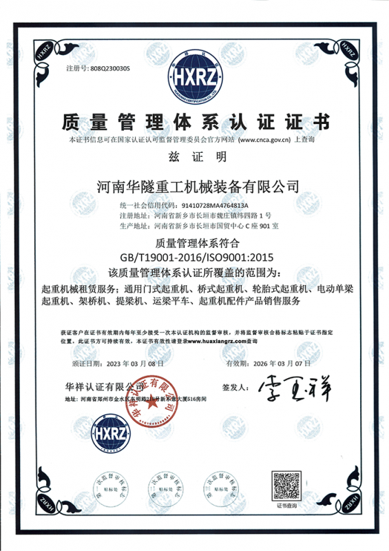河南華隧重工機(jī)械裝備有限公司主要從事通用門式起重機(jī)、橋式起重機(jī)、電動(dòng)單梁起重機(jī),輪胎式起重機(jī)、架橋機(jī)、提梁機(jī)、遠(yuǎn)梁平車、鋼絲繩電動(dòng)萌蘆、卷揚(yáng)機(jī)、起重配件制造、銷售:起重機(jī)械租賃、安裝和維修,起重設(shè)備園收,機(jī)械設(shè)備維修,鋼結(jié)構(gòu)工程承包,橋梁工程及技術(shù)咨淘服務(wù),銷售五金制品、機(jī)電設(shè)備:建設(shè)工程監(jiān)理,建設(shè)工程設(shè)計(jì),各類工程建設(shè)活動(dòng),建筑勞務(wù)分包,建筑物折除作業(yè),施工作業(yè),工程管理服務(wù),土石方工程施工,裝如發(fā)運(yùn)?! 」疽淹ㄟ^IS0國際質(zhì)量、環(huán)境、健康與安全三合一標(biāo)準(zhǔn)認(rèn)證,特種設(shè)備制造許可證和特種設(shè)備安裝改造維修許可證。擁有完熟的質(zhì)量管理體系。嚴(yán)格的管理制度,強(qiáng)大的生產(chǎn)能力和先進(jìn)的檢測手段,在保證產(chǎn)品質(zhì)量的同時(shí),也具備了極強(qiáng)的市場競爭力?! 」緢?jiān)持科技創(chuàng)新為理念,產(chǎn)品質(zhì)量為核心,注重信譽(yù),建立了減信可靠、快捷、思速。便利周到的售后服務(wù)網(wǎng)絡(luò)?! ∥覀儞碛械募夹g(shù)專家和技術(shù)服務(wù)隊(duì)伍為客戶提供充善的售前技術(shù)支持和全天候的售后服務(wù)體系,讓您無后顧之憂,享受一站式的超值服務(wù)。  “華隧重工,伴您成功“是華隧重工永遠(yuǎn)的宗指,真被的希望與各界朋友攜手并進(jìn)。共創(chuàng)輝準(zhǔn)!